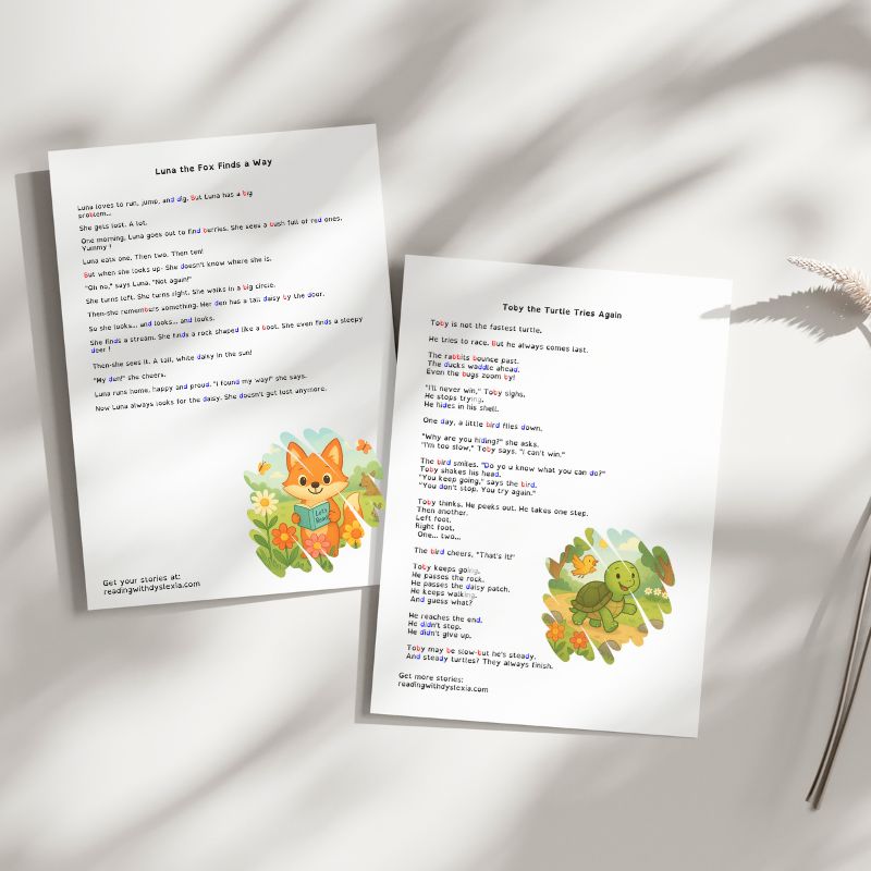 Our weekly printable stories are designed to support early readers with dyslexia — while giving you one less thing to worry about.